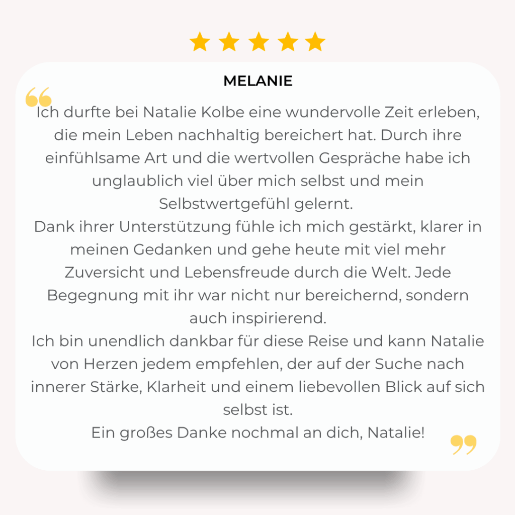 Mit viel Feingefühl helfe ich dabei, negative Gedankenmuster zu durchbrechen, die Kraft der Gedanken zu nutzen, das Selbstbewusstsein zu stärken und wieder Vertrauen in sich selbst zu entwickeln.